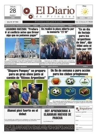 Por otro lado, va  a haber cantinas de los clubes para que la gente pueda almorzar, y  después va a tocar la banda "Escuálidos", una banda de rock, que una parte de sus integrantes son pringlenses también y que la verdad están andando muy bien.  Después va a ser el desfile, seguido van a tocar "Los Sapos de Juan", la banda de cumbia local y vamos a cerrar con "Banda XXI", con un gran show, banda de cuarteto fusión que es conocida a nivel nacional", expresó el Intendente.