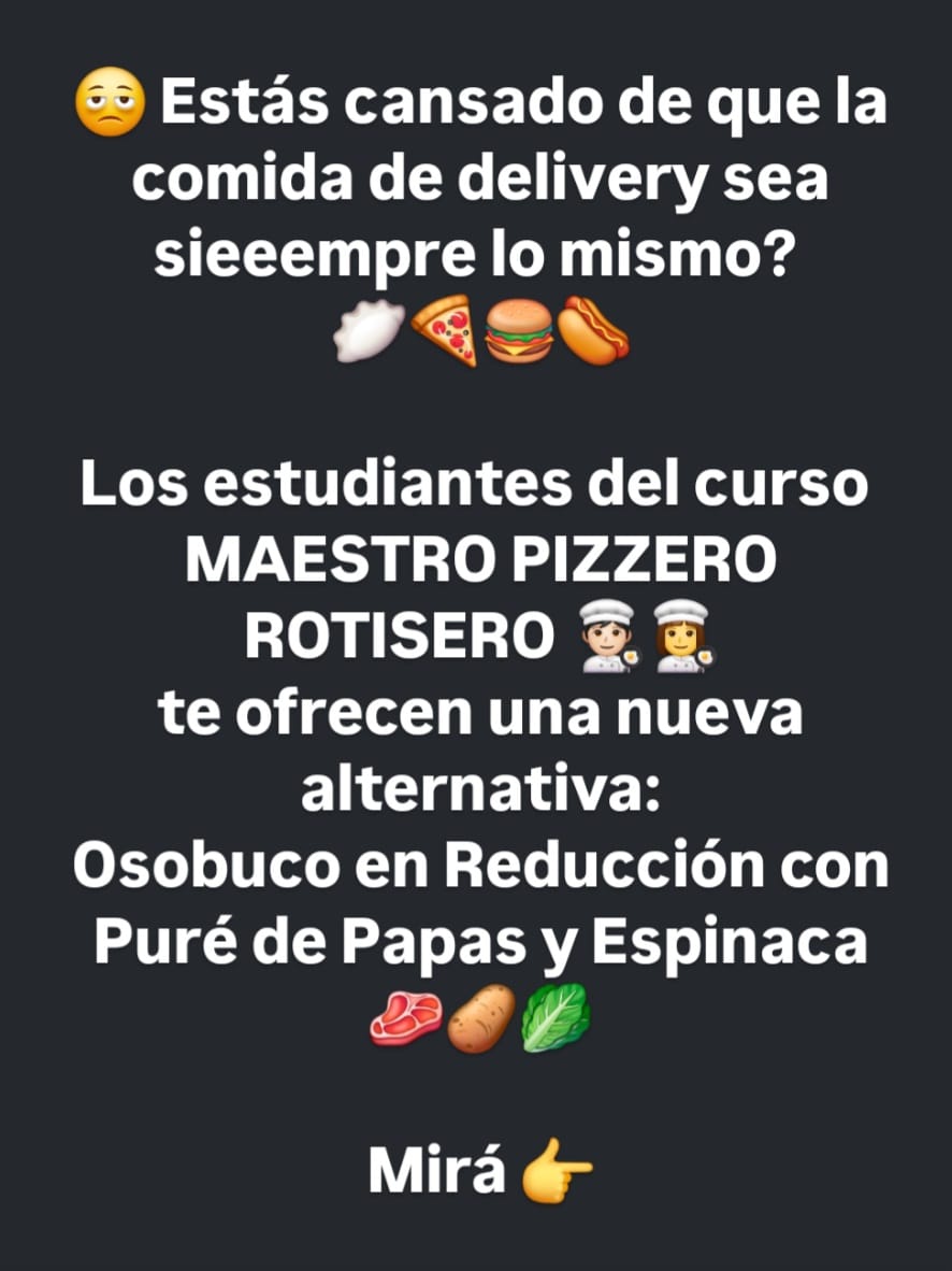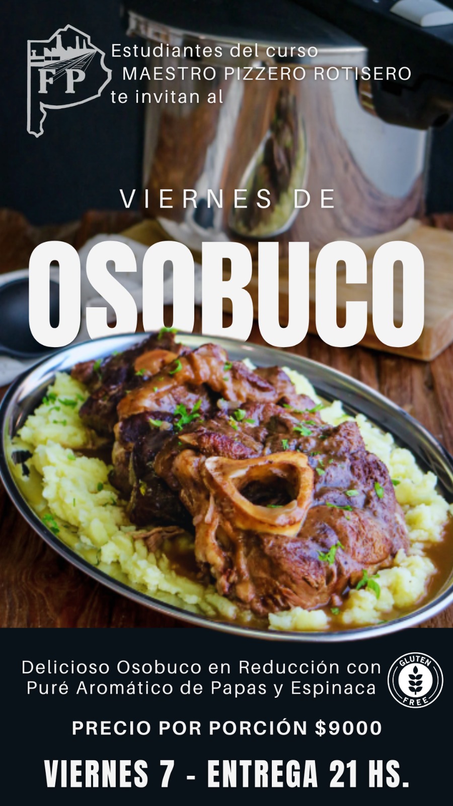 Este viernes los alumnos del curso de maestro pizzero roticero ofrecerán a la venta osobuco en reducción con puré de papas y espinaca.