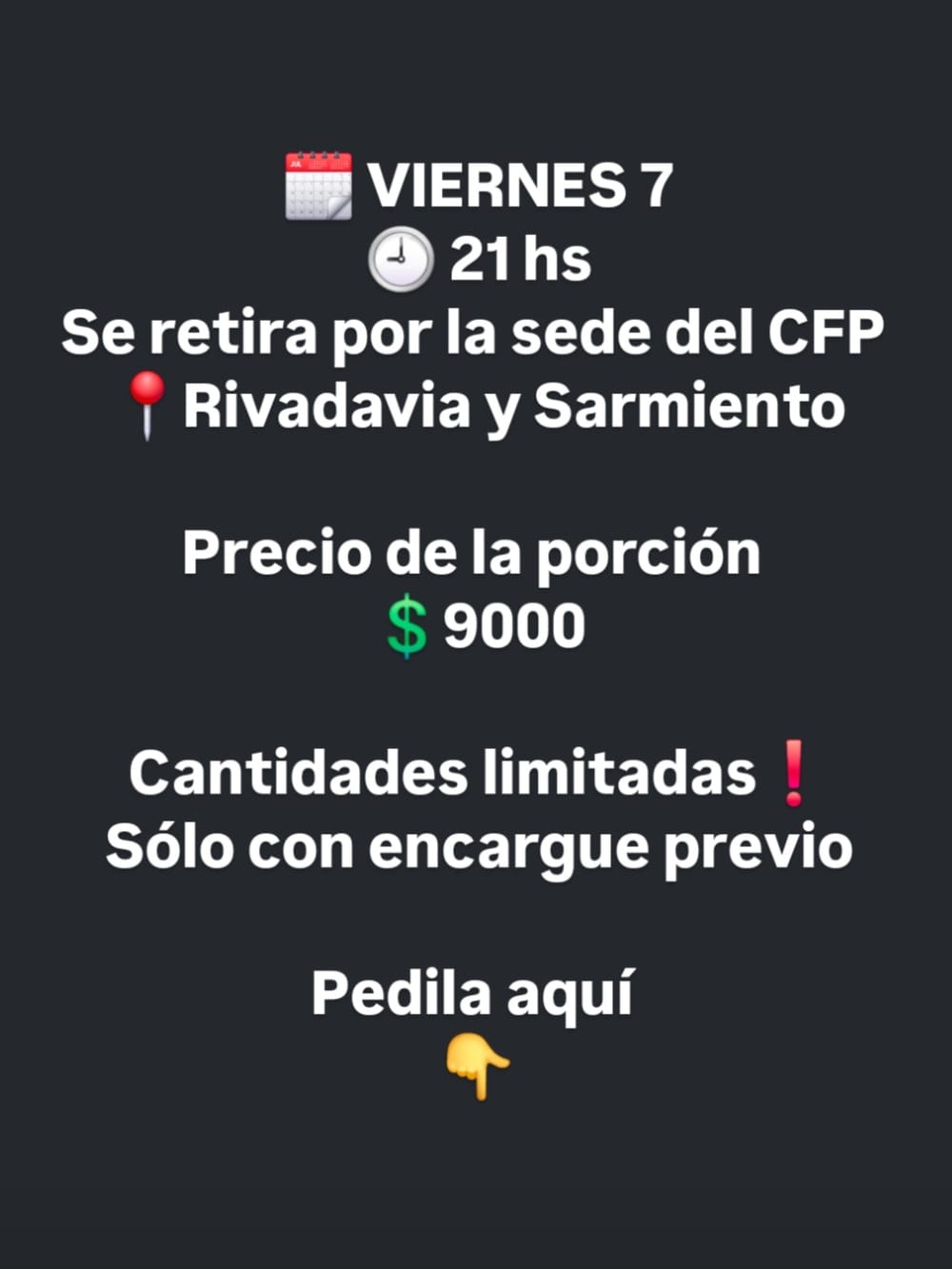 El precio por porción será de $ 9.000 y se entregará a partir de la hora 21:00 hs. siendo las cantidades limitadas.
