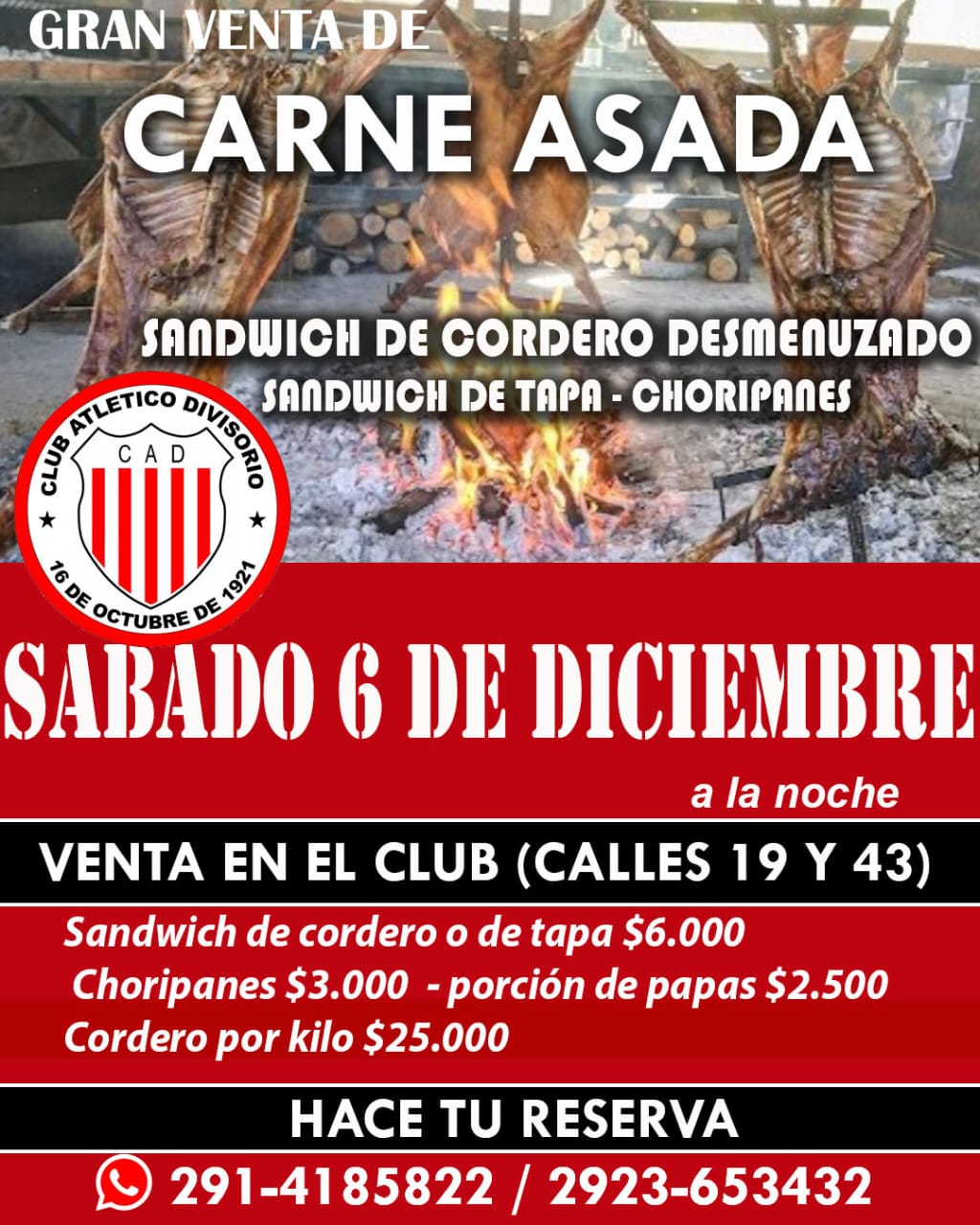 El próximo sábado 6 de diciembre se realizará la venta de carne asada en el club El Divisorio.
