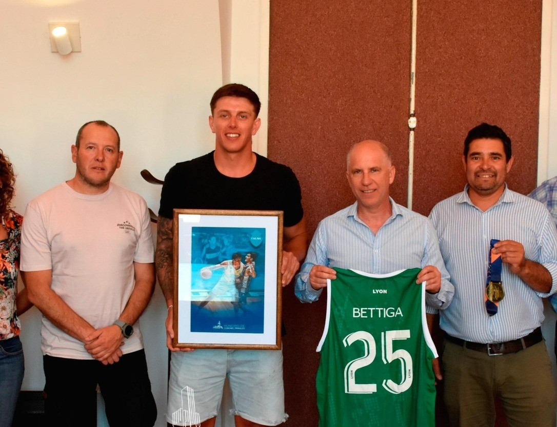 En la mañana del lunes 22 de diciembre, el intendente municipal Lisandro Matzkin recibió en su despacho al basquetbolista pringlense Valentín Bettiga, quien recientemente se consagró campeón del Sudamericano de Básquet como integrante del plantel del Club Ferro Carril Oeste.