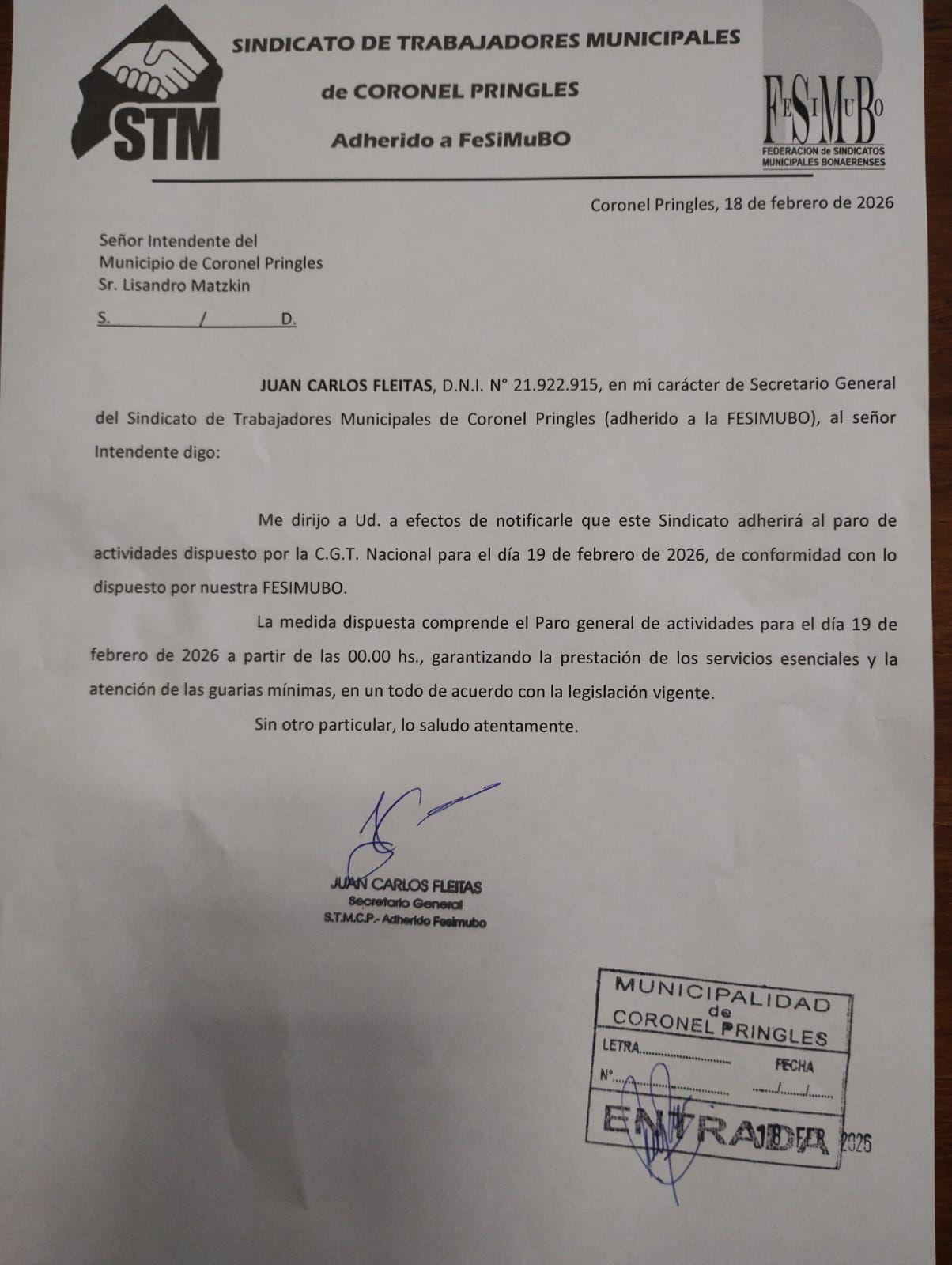 En el escrito, Fleitas expresó: "Me dirijo a Ud. a efectos de notificarle que este Sindicato adherirá al paro de actividades dispuesto por la C.G.T. Nacional para el día 19 de febrero de 2026, de conformidad con lo dispuesto por nuestra FESIMUBO".