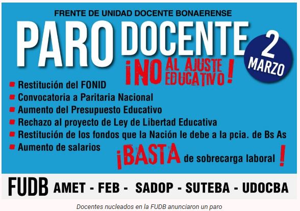 El Frente de Unidad Docente Bonaerense (FUDB) anunció un paro de actividades para el 2 de marzo. La medida de fuerza complicaría el inicia del ciclo lectivo 2026 ya que ese lunes deberían empezar las clases.