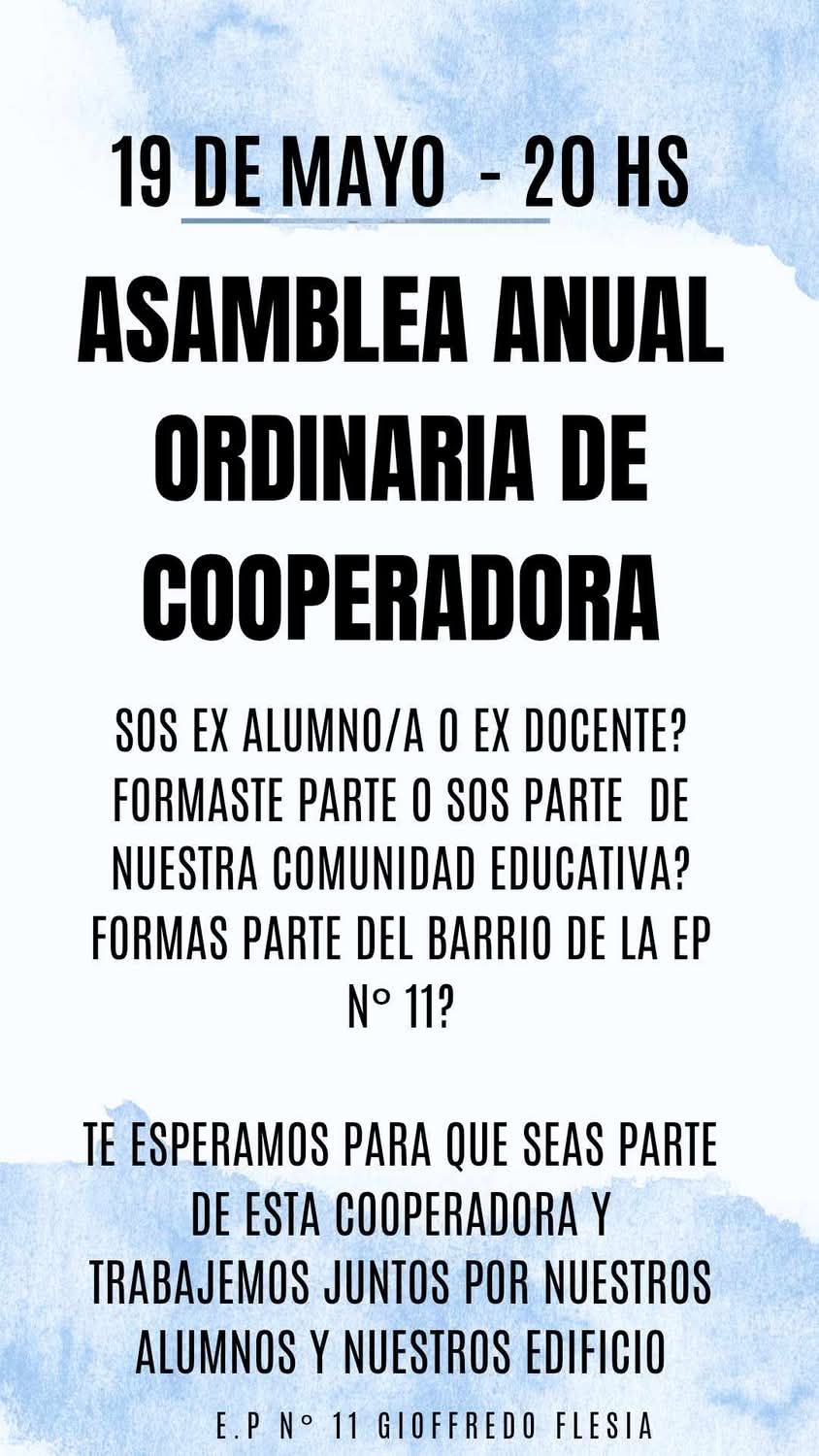 El venidero 19 de mayo a la hora 20:00 se realizará la asamblea anual ordinaria de la cooperadora de la Escuela Nº 11.