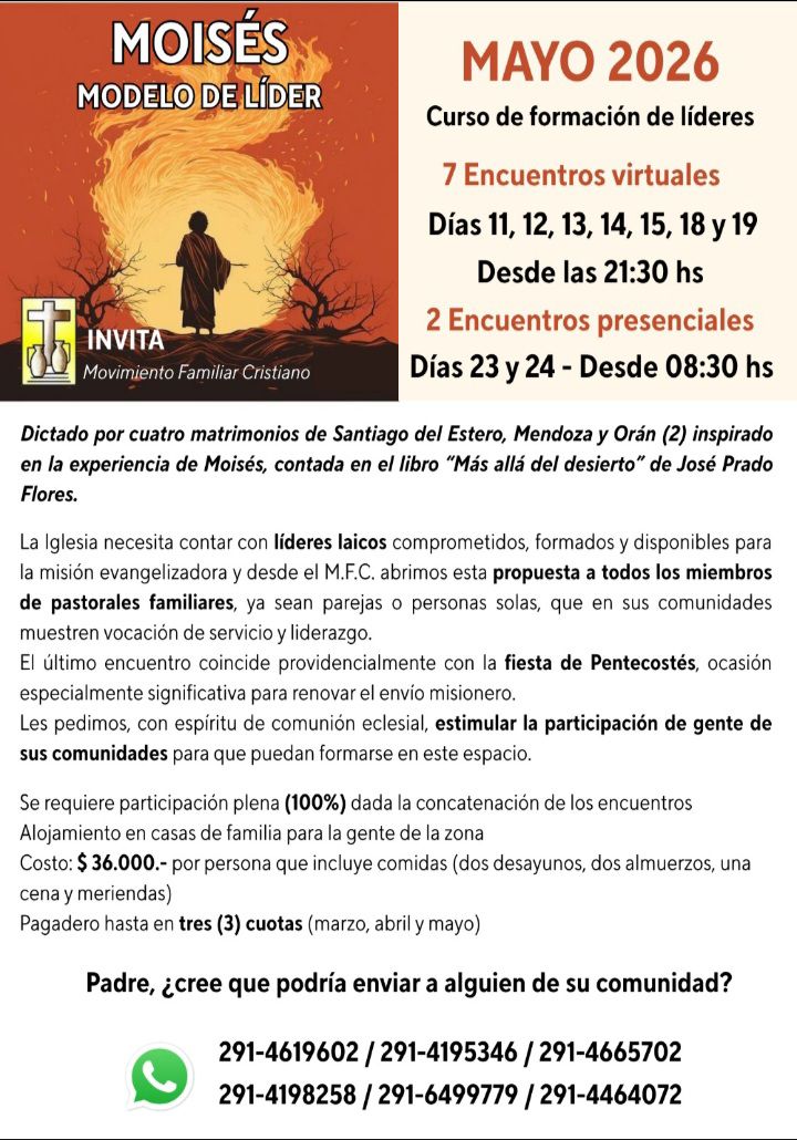 La iglesia necesita contar con líderes laicos comprometidos, formados y disponibles para la misión evangelizadora y desde el Movimiento Familiar Cristiano se invita a todos los miembros de pastorales familiares a participar comunicándose a algunos de los números 291 4619602 o 291 4195346.