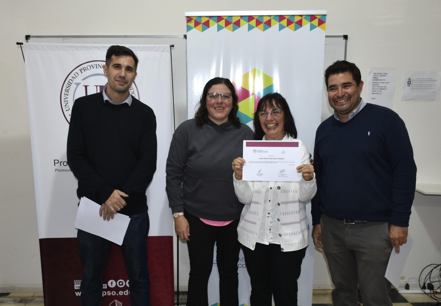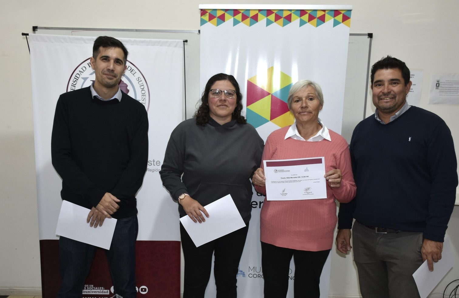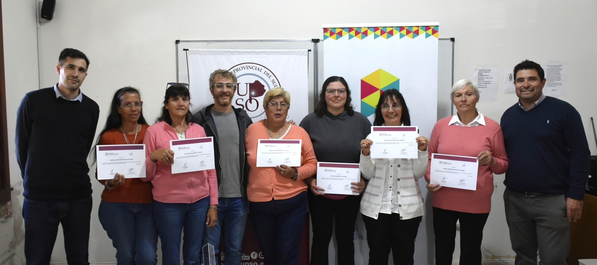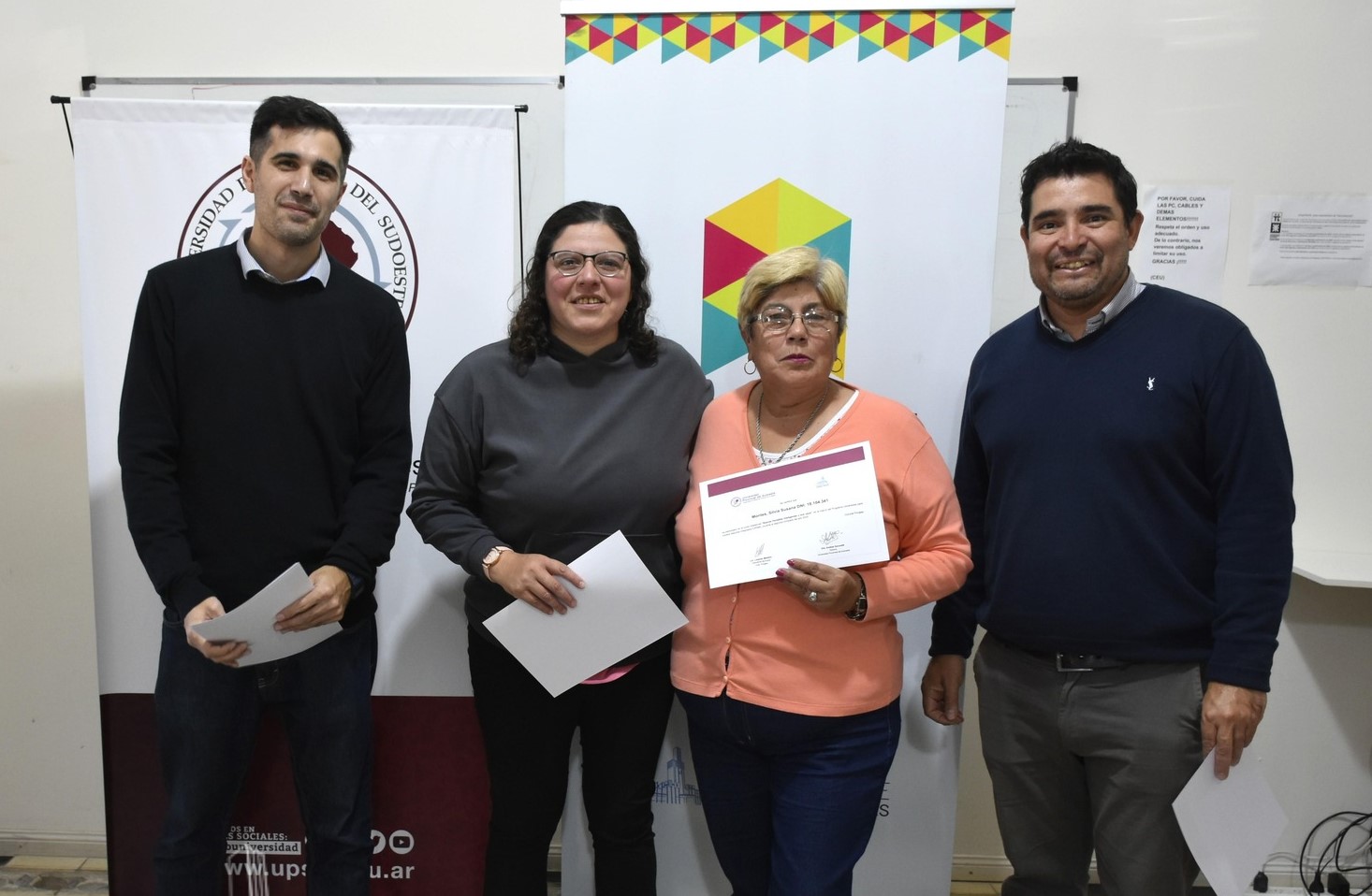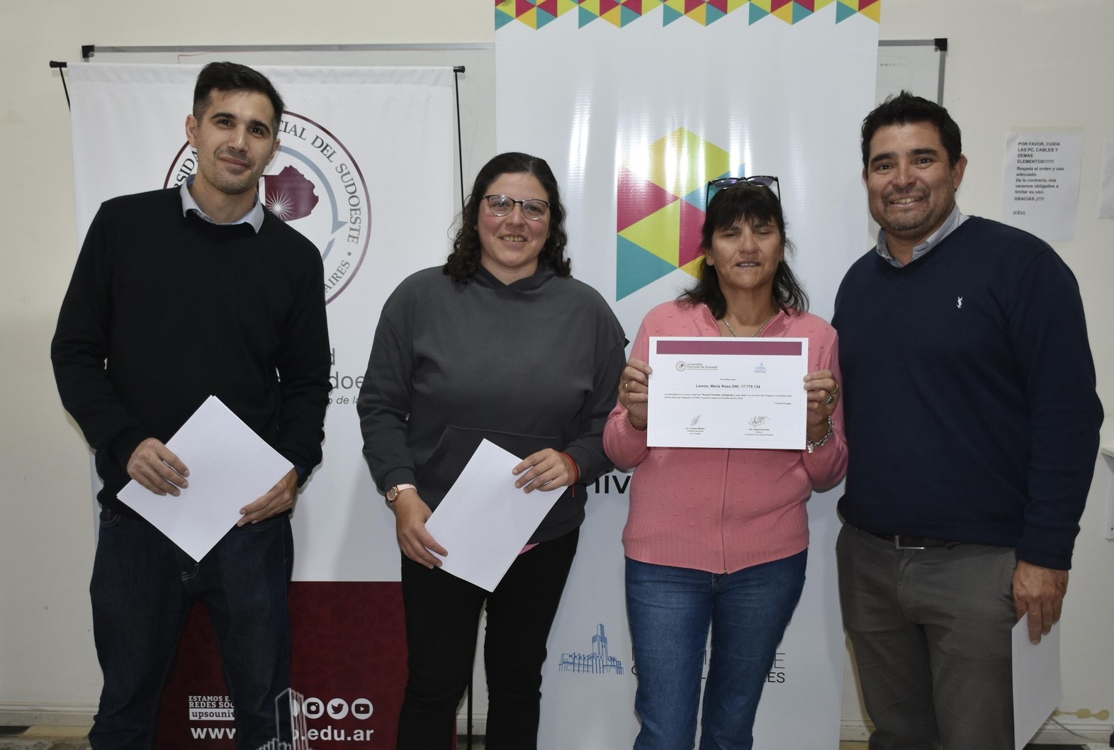 Durante la entrega estuvieron presentes Ignacio Tonelli (Subdirector de Educación y Juventud), Oscar Rossi (Secretario de Desarrollo), Juan Manuel Salas (director de Extensión Sociocultural y Bienestar Universitario de la UPSO) y la docente a cargo del curso, Andrea Souto.