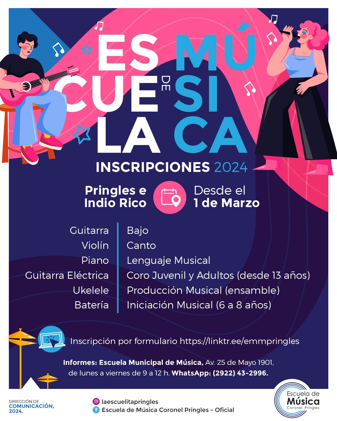 ESCUELA MUNICIPAL DE MÚSICA: Ya están abiertas las inscripciones para Pringles e Indio Rico
