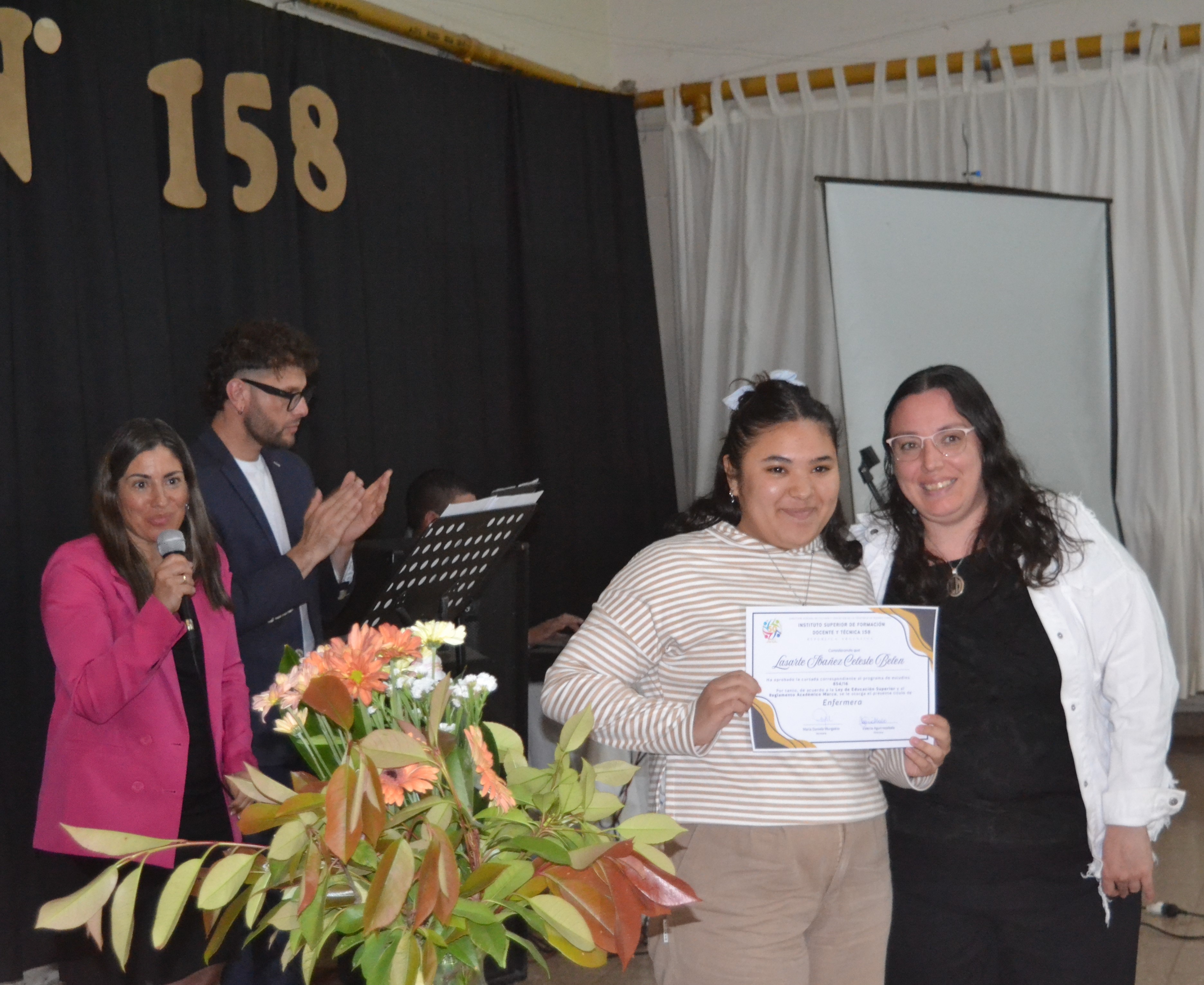 La vicedirectora del Instituto de Formación Docente y Técnica N° 158, Valeria Aguirrezabala, brindó emotivas palabras antes del acto de entrega de diplomas, destacando el trabajo de los egresados, sus familias y del equipo docente que sostiene el funcionamiento del instituto.  "Éste es un instituto que hace 50 años permite que nuestra comunidad tenga egresados y egresadas formados con compromiso. Elegimos las carreras que abrimos con mucha responsabilidad, pensando siempre en nuestro contexto y en las necesidades locales", remarcó.
