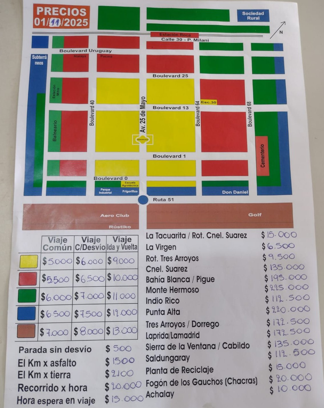 En el detalle de tarifas específicas, los recorridos locales y zonales quedaron de la siguiente manera: hasta La Tacuarita o la Rotonda de Coronel Suárez costará 15.000 pesos; a la Gruta Virgen del Camino, 6.500; a Coronel Suárez, 135.000; a Indio Rico, 112.500; a Saldungaray, 112.500; y a Sierra de la Ventana o Cabildo, 135.000.