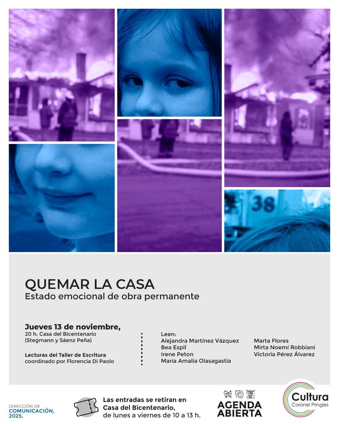 Este jueves por la noche, la Casa del Bicentenario será escenario del cierre anual del Taller de Escritura que coordina la escritora y docente Florencia Di Paola. La propuesta, titulada "Quemar la casa. Estado emocional de obra permanente", sintetiza un año de trabajo literario colectivo en el que la exploración, la lectura y la escritura fueron las protagonistas.