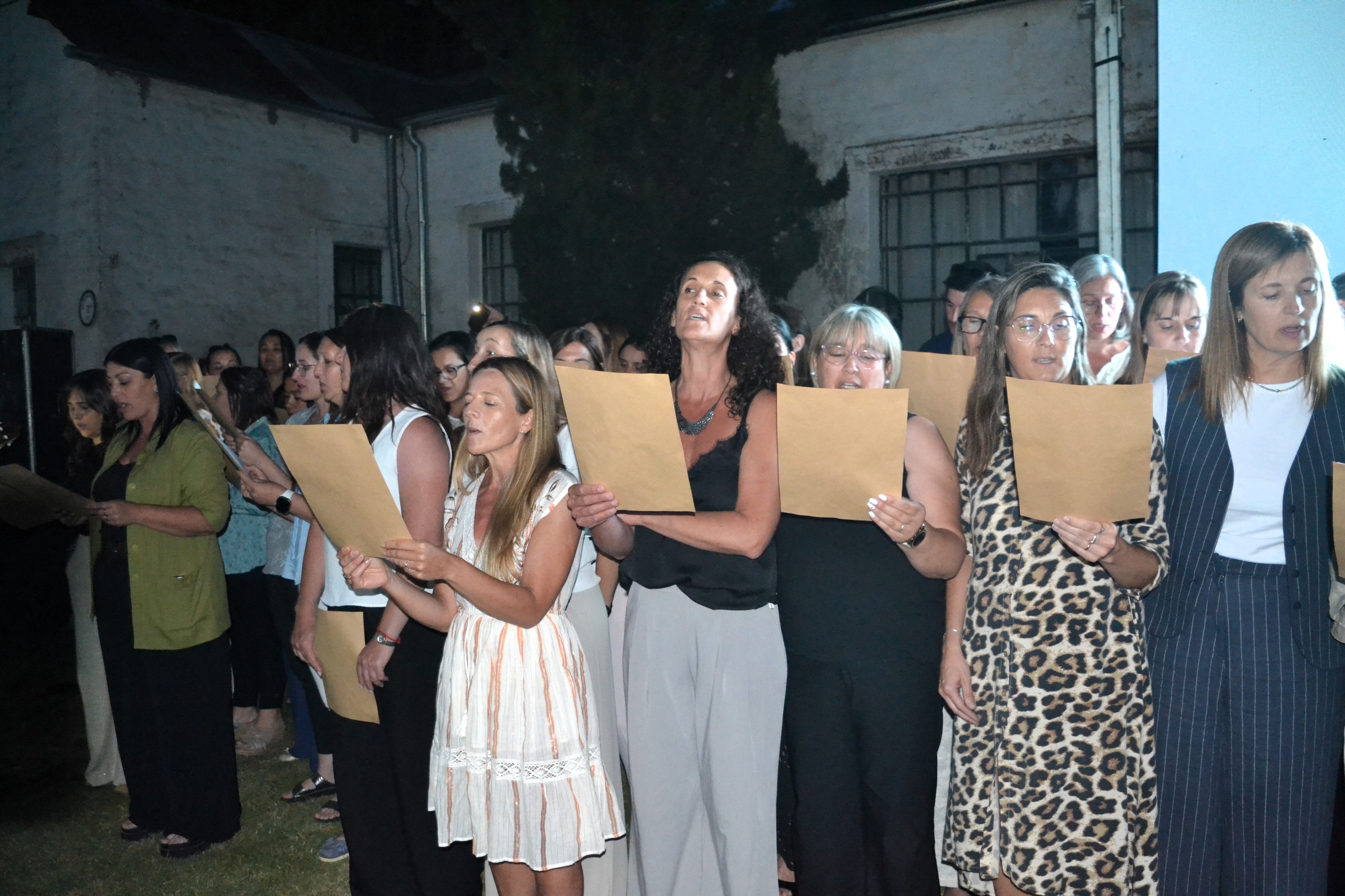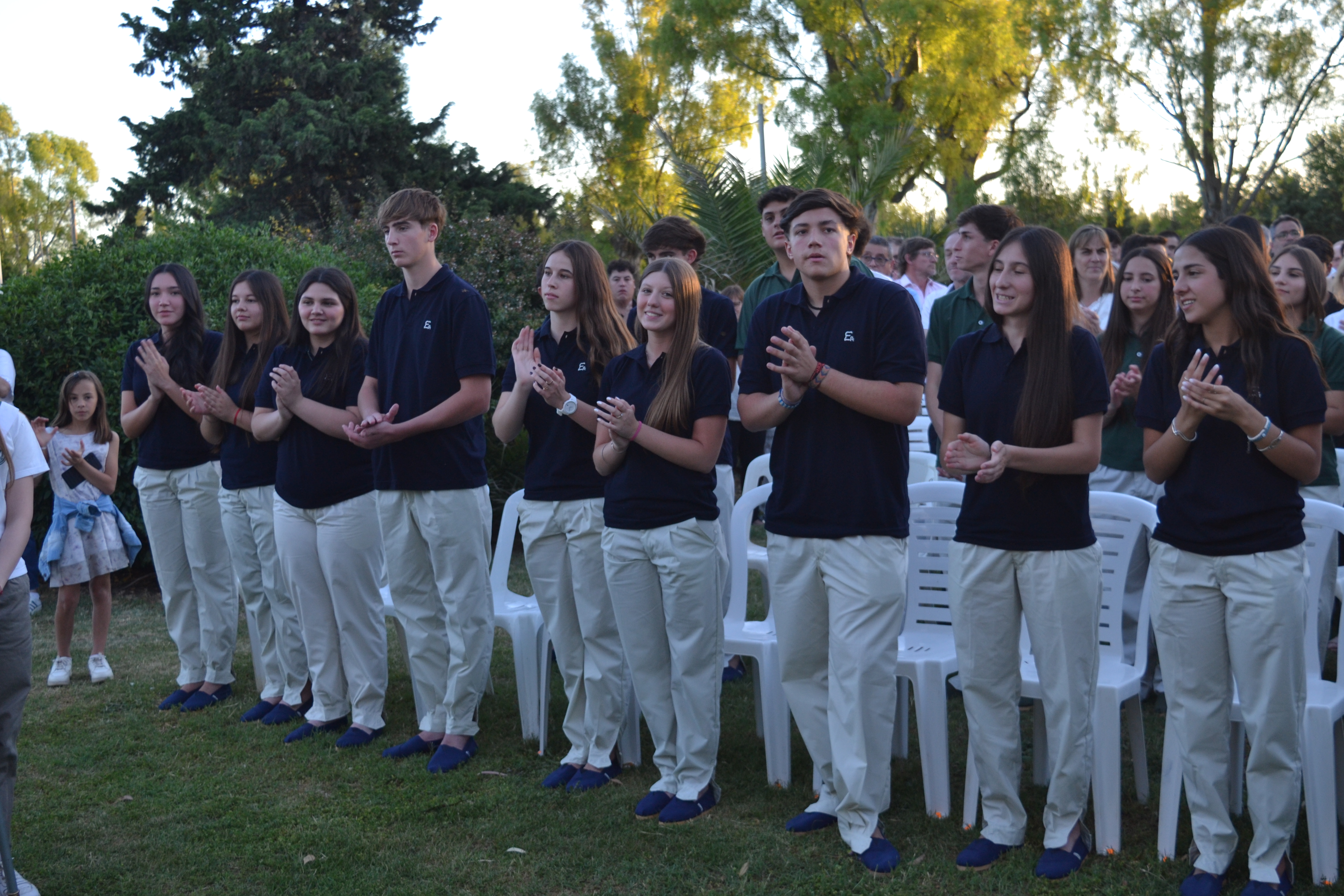 En el tramo final de la ceremonia, los abanderados se retiraron y se invitó a los padres de los egresados a pasar al frente para interpretar una emotiva canción de despedida. Luego, los jóvenes se sentaron por última vez en el césped de la escuela para escuchar las palabras de la directora Natalia Martel. La proyección de imágenes que repasaron su paso por la institución y una iluminación cenital que destacó a los egresados, entre sonrisas y lágrimas, marcaron el cierre del acto formal.