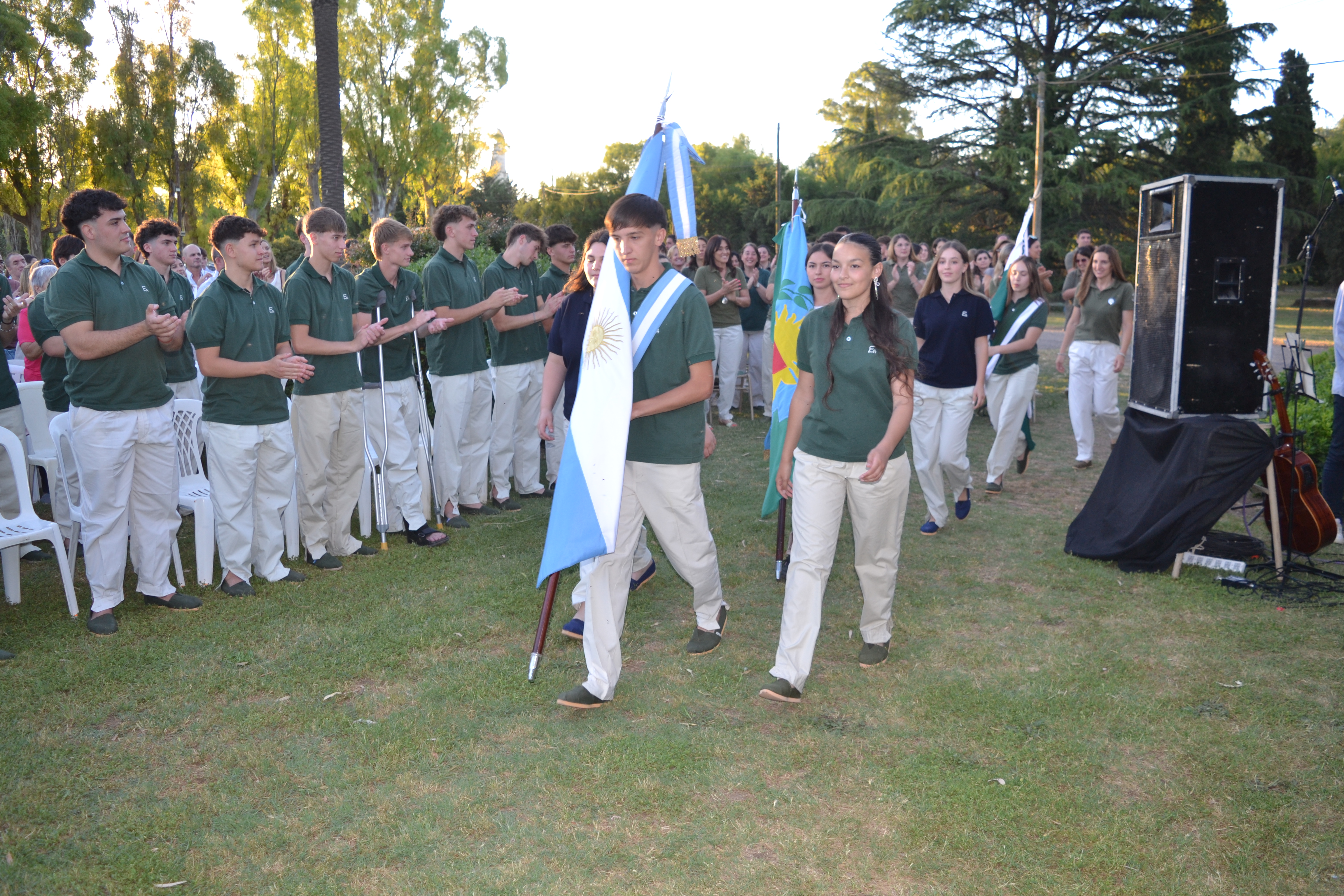 Una vez en escena la totalidad de los egresados, se realizó el ingreso de las banderas de ceremonia. La Bandera Nacional fue portada por Ariel Rincón como abanderado, acompañado por Delfina Gelso como primera escolta y Bárbara Recofsky como segunda escolta. La Bandera Bonaerense estuvo a cargo de Catalina Moro Erasun, junto a Gonzalo Menéndez y Elena Díaz Valentini, mientras que la Bandera de la Escuela Agrotécnica fue portada por Fiamma Martínez. Posteriormente, se entonaron las estrofas del Himno Nacional Argentino y se concretó el tradicional recambio de abanderados.