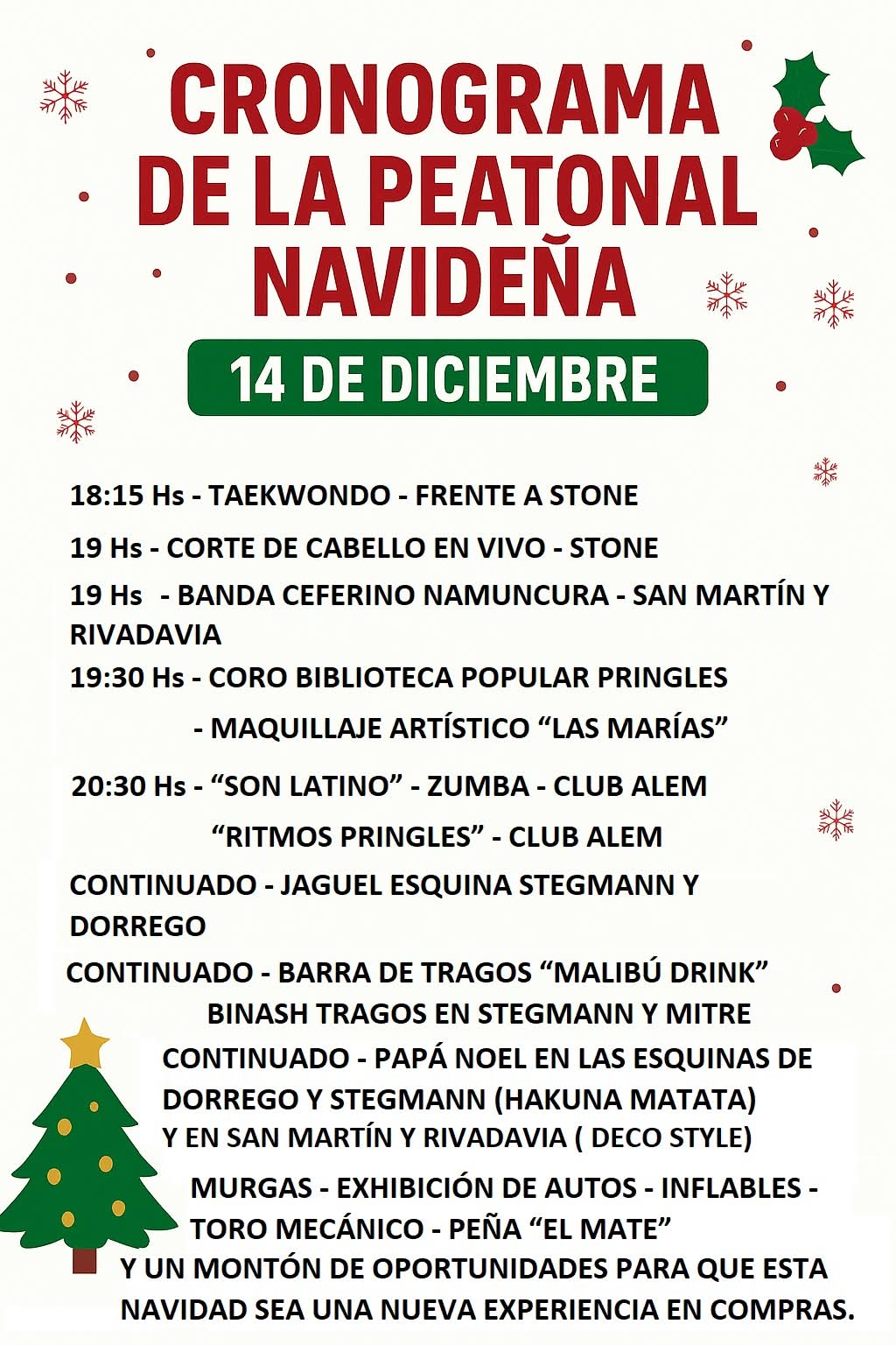 La Asociación de Industria y Comercio presentó los detalles de una nueva edición de la Peatonal Navideña, que se desarrollará este domingo 14 de diciembre desde las 18 horas en las calles centrales de la ciudad. La tradicional propuesta, que cada año reúne a comercios, artistas, instituciones y familias, se desplegará nuevamente en la "Vuelta del Perro", comprendida entre Stegmann, San Martín, Mitre y Rivadavia.