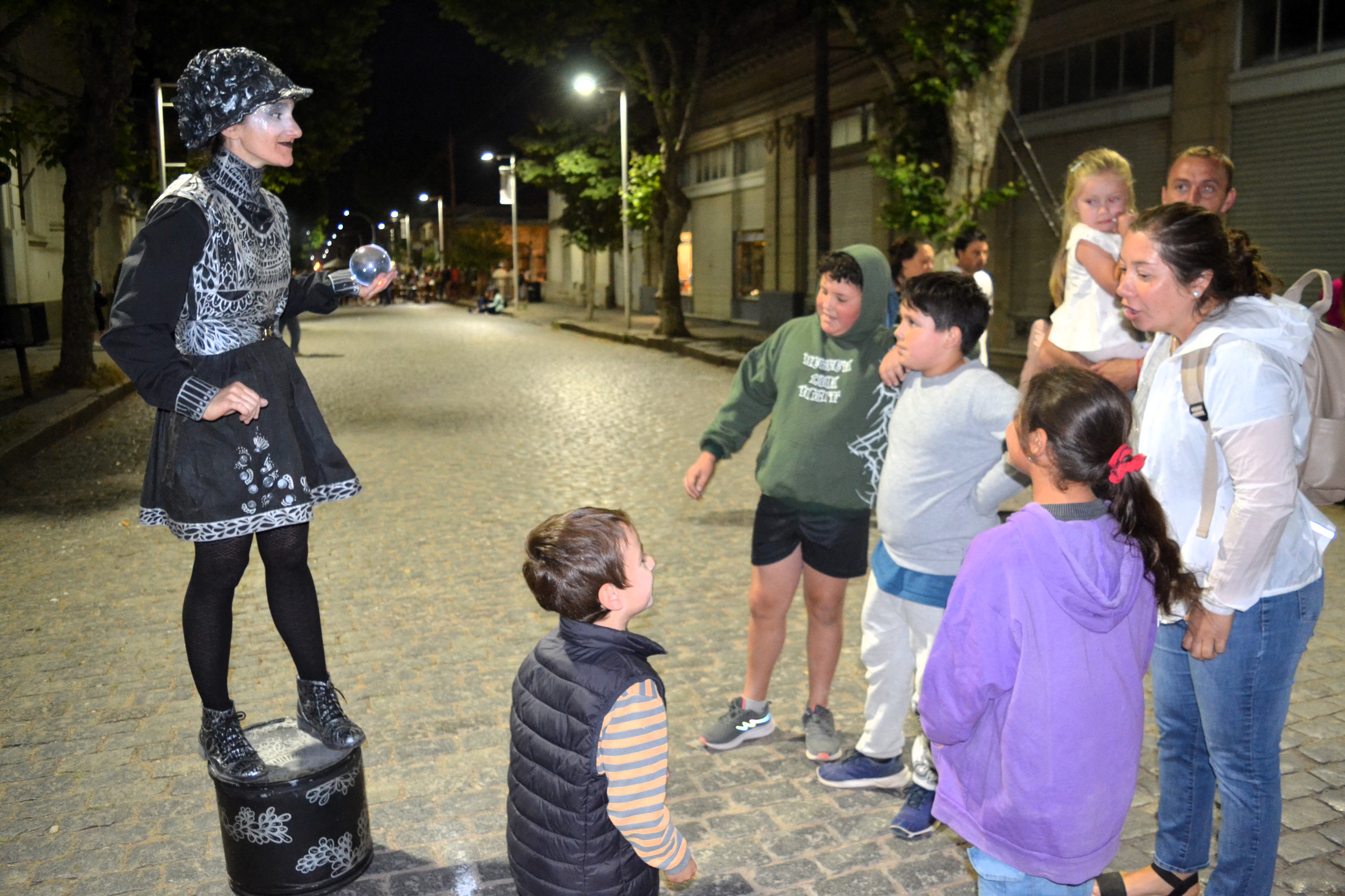 Como en cada edición, los emprendedores y artesanos locales tuvieron su espacio, aportando variedad y creatividad al recorrido. Incluso una estatua viviente captó la atención del público infantil en una de las esquinas, convirtiéndose en uno de los atractivos más fotografiados de la noche.