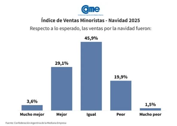 Según los comerciantes, el desempeño de las ventas presentó un balance dispar. El 32,7% señaló que los resultados fueron mejores o mucho mejores de lo esperado, mientras que el 21,4% consideró que estuvieron por debajo de sus previsiones. En tanto, el 45,9% afirmó que las ventas se ubicaron en línea con lo que habían proyectado.