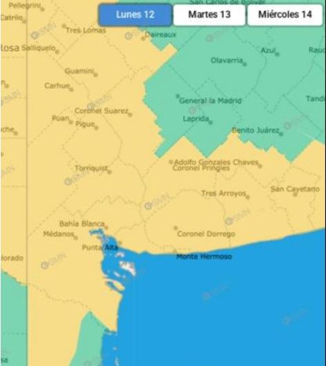 El aviso alcanza, además de Bahia Blanca, a los distritos de Coronel Rosales, Monte Hermoso, Coronel Dorrego, Villarino, Puan, Coronel Pringles, Coronel Suárez, Saavedra y Tornquist, además del oeste de Patagones. También incluye al este de La Pampa.