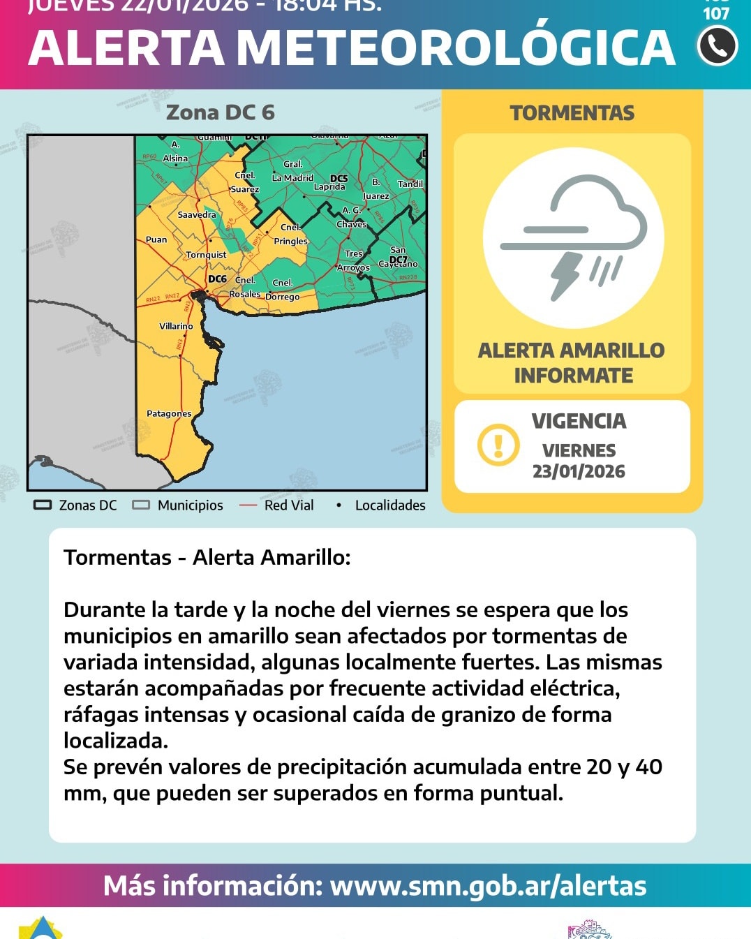 El Servicio Meteorológico Nacional (SMN) informó una nueva alerta amarilla por tormentas para la tarde de este viernes en Coronel Pringles y la zona.