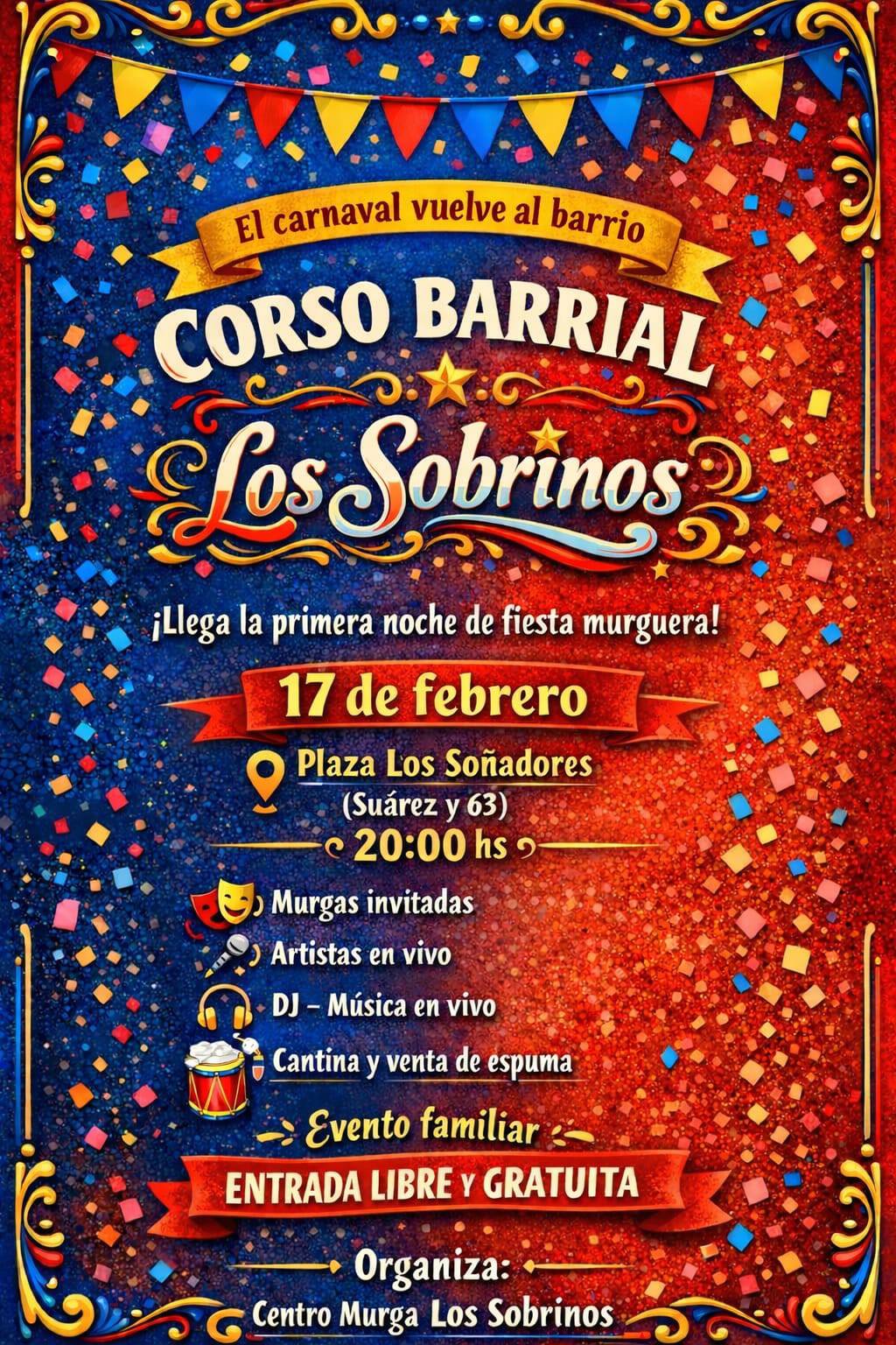 El próximo 17 de febrero, desde las 20:00 horas, la Plaza Los Soñadores (Suárez y 63) será escenario, por primera vez, de un corso barrial impulsado por el Centro Murga "Los Sobrinos". La propuesta promete una noche cargada de música, color y espíritu comunitario, pensada para toda la familia.