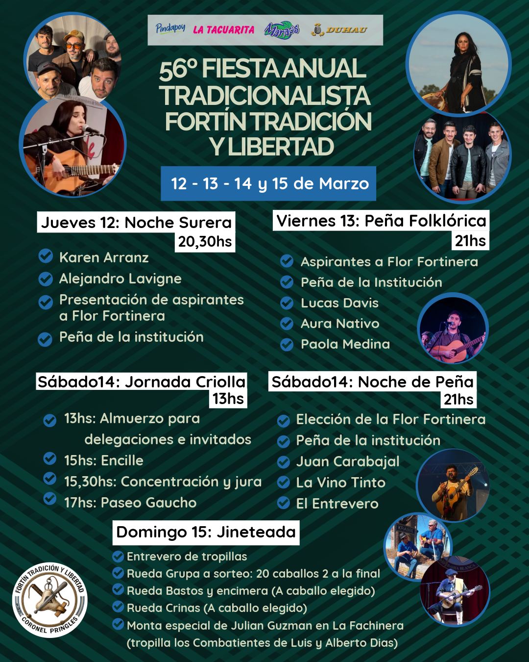 Las actividades comenzarán el jueves con una propuesta musical que contará con la presencia de Karen Arranz y Alejandro Lavigne, dos reconocidos exponentes de la música surera provenientes de Bahía Blanca. El viernes será el turno de una presentación especial que genera gran expectativa, ya que una artista radicada actualmente en Coronel Pringles realizará su primera actuación como solista. "La suerte de hoy en día tenerla acá, radicada en Coronel Pringles, ella es santiagueña, y era integrante del dúo Heredero y ahora se largó con su carrera solista y va a hacer su primera presentación como carrera solista, así que estamos muy contentos de tener una artista de esa talla el día viernes", explicó Villafañe.