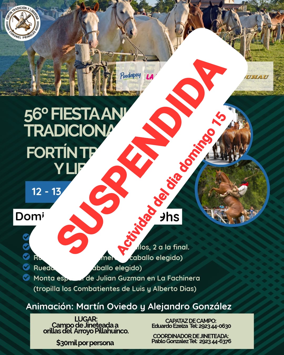 Sin embargo, la lluvia caída obligó a tomar la determinación de suspender las actividades para evitar inconvenientes con el traslado de caballos y jinetes. "El pronóstico está firme para el domingo y en la zona está lloviendo muchísimo. En Coronel Pringles está parando (por ayer en la tarde), pero lamentablemente, si está lloviendo en la zona, la gente no va a poder venir, y hay muchos caballos que venían del lado de Coronel Dorrego, donde ha llovido mucho, así que nos están avisando que no van a poder salir", señaló Muñoz.