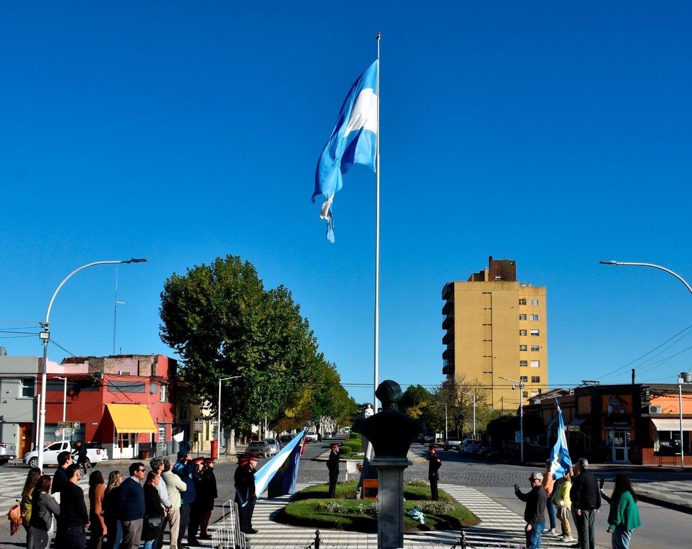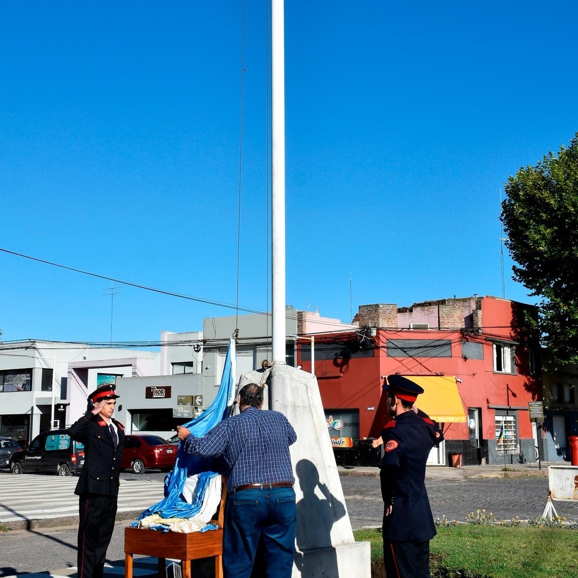 La ceremonia comenzó con el izamiento del Pabellón Nacional en el mástil principal, a cargo del secretario de Gobierno y Seguridad, Sergio Jackson, quien estuvo acompañado por integrantes del Cuerpo de Bomberos Voluntarios de Coronel Pringles.