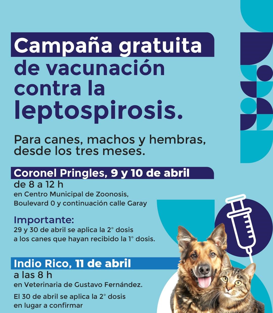En esta localidad, la vacunación contra la leptospirosis tendrá lugar el sábado 11 de abril en el marco de la Campaña mensual de castración y vacunación antirrábica gratuita; y el refuerzo se dará el jueves 30 de abril.