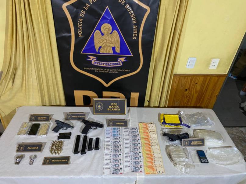 La Policía secuestró dos pistolas Bersa, una calibre 22 y otra 9mm, ambas con cargadores; dos cargadores más extensibles con 10 y 17 municiones; dos relojes pulsera; una balanza de precisión y 6 envoltorios con formato rectangular (tipo ladrillo) con restos de sustancia blanca que sería cocaína.
