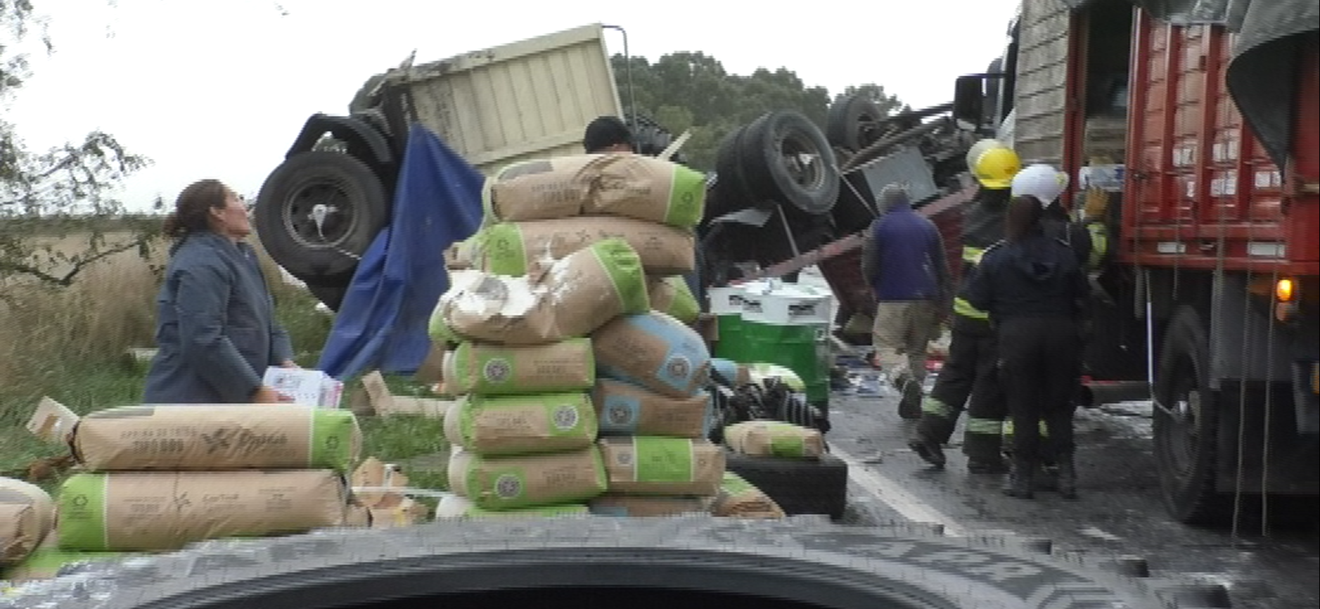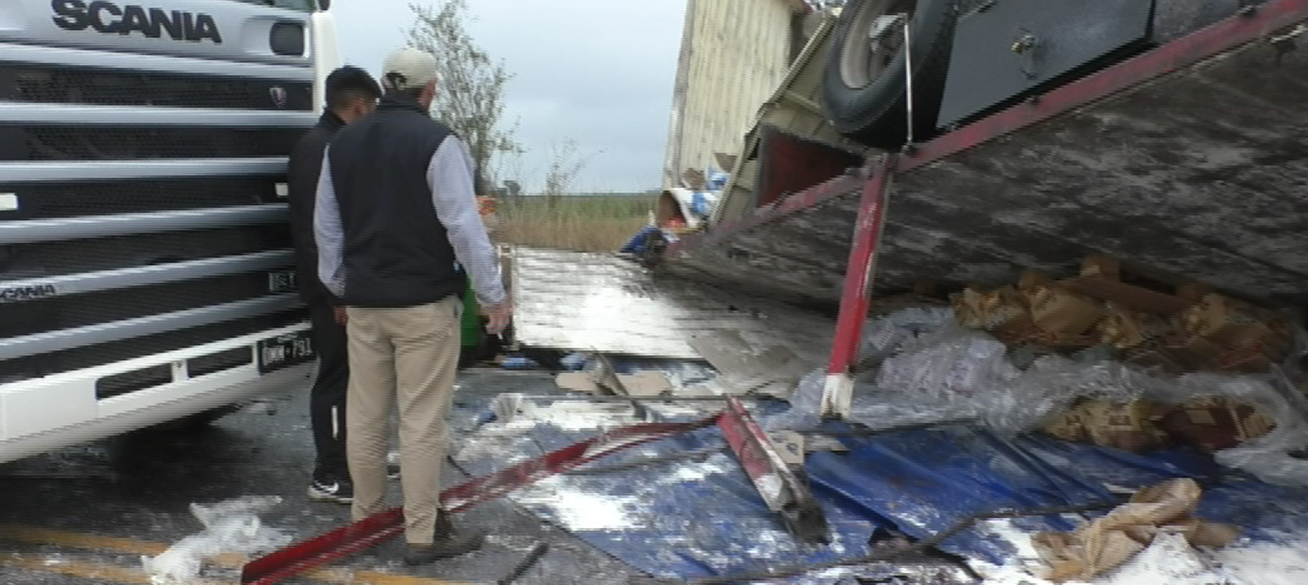 Por causas que aún se intentan establecer, el vehículo perdió estabilidad y terminó volcando su acoplado y parte de su estructura, lo que provocó que la carga quedara desparramada sobre el pavimento, imposibilitando la circulación en ambos sentidos.