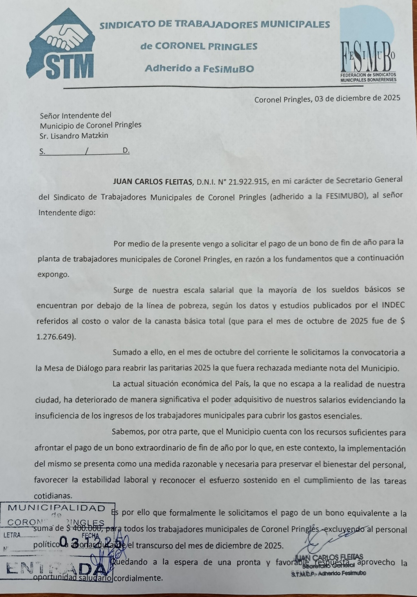 Este miércoles, el Sindicato de Trabajadores Municipales de Coronel Pringles, adherido a FESIMUBO, elevó una nota al Departamento Ejecutivo para solicitar la entrega de un bono de fin de año de $400.000 destinado a la totalidad de los trabajadores y trabajadoras municipales, excluyendo al personal político.