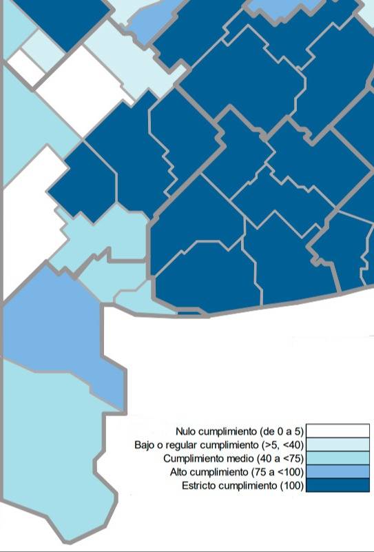 Así, en la categoría denominada Cumplimiento estricto, donde se ubican los distritos que alcanzan el puntaje máximo de 100, se encuentran 63 municipios de toda la provincia (47%, aproximadamente), de los cuales una decena forma parte de la Sexta Sección Electoral: Adolfo Gonzales Chaves, Benito Juárez, Monte Hermoso, Coronel Dorrego, Coronel Pringles, Coronel Suárez, General La Madrid, Saavedra, Tres Arroyos y Laprida.
