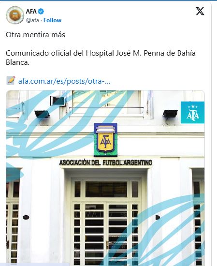"Otra mentira más -se indicó a través de las redes sociales-. La Casa del Fútbol Argentino manifiesta una vez más su compromiso solidario dejando en claro que sin ningún tipo de necesidad, la AFA, llevó adelante una acción que debería haberse realizado desde los organismos públicos y gubernamentales".