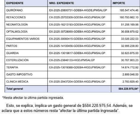 Por ejemplo, en el apartado Quirófano, se utilizaron 185.547.474,46 pesos; Refacciones, $160.793.662,10; Neonatología, $51.258.169,98; Oftalmología, $36.658.879,62; Equipamientos varios, $33.026.222,03; Partos, $32.995.238,80; Guardia, $32.623.875,00; Esterilización, $30.767.803,23; Terapia, $14.874.772,92; Gasto impositivo, $2.899.048,00, y Clínica médica, 2.783.829,40.