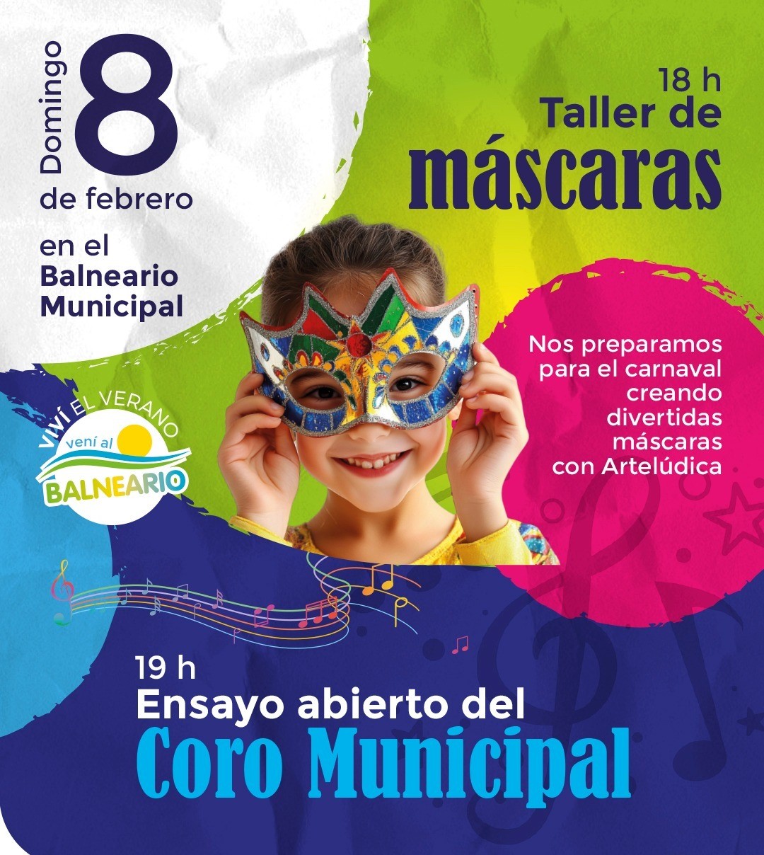 Hoy domingo 8 de febrero, en el marco del Verano 2026, se realizará un taller de máscaras y un ensayo abierto del Coro Municipal, con propuestas gratuitas para disfrutar en comunidad.