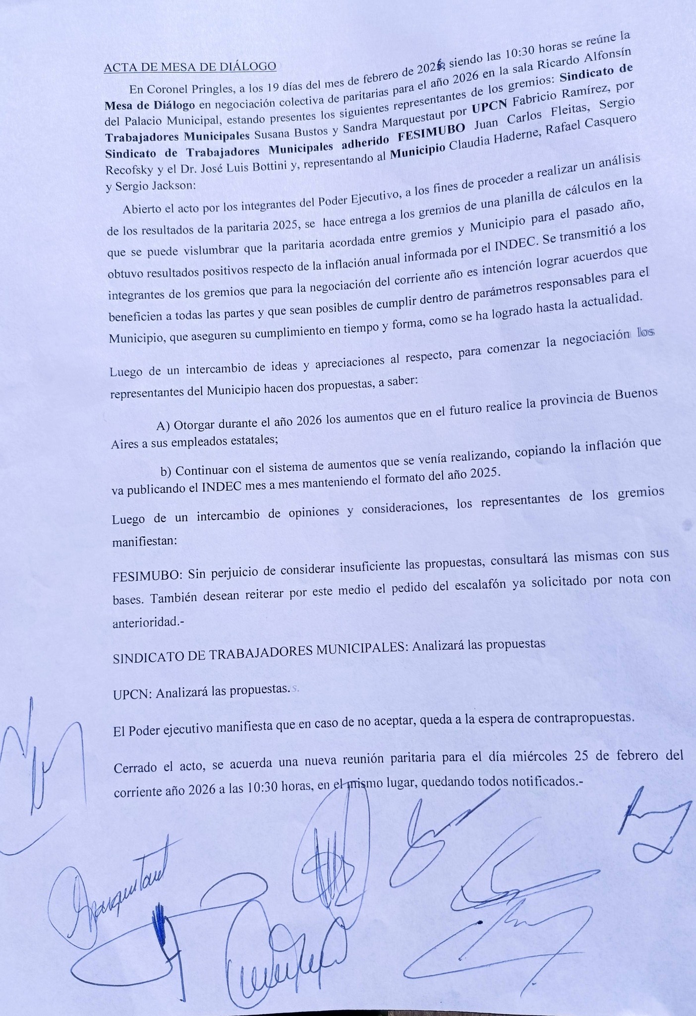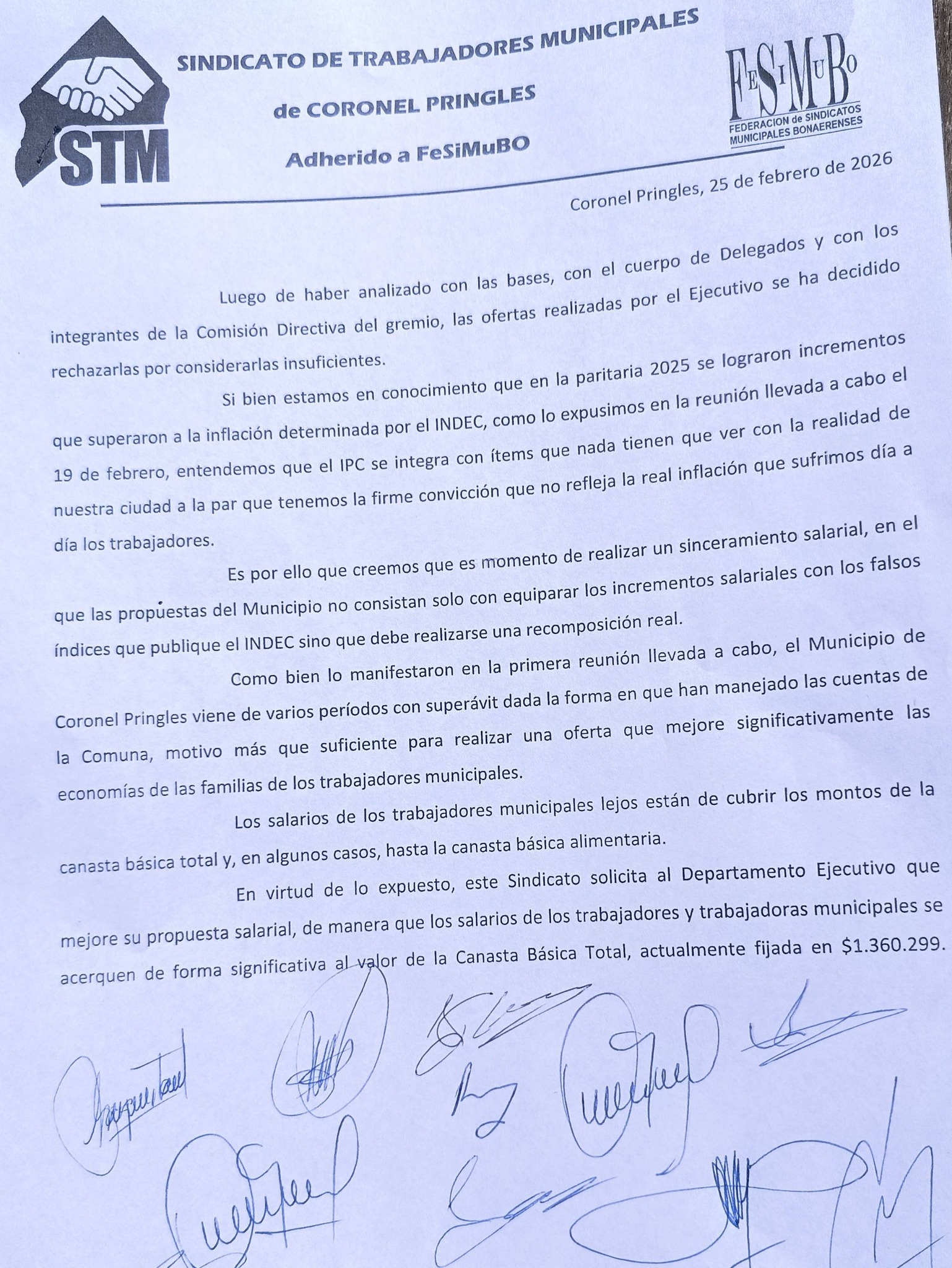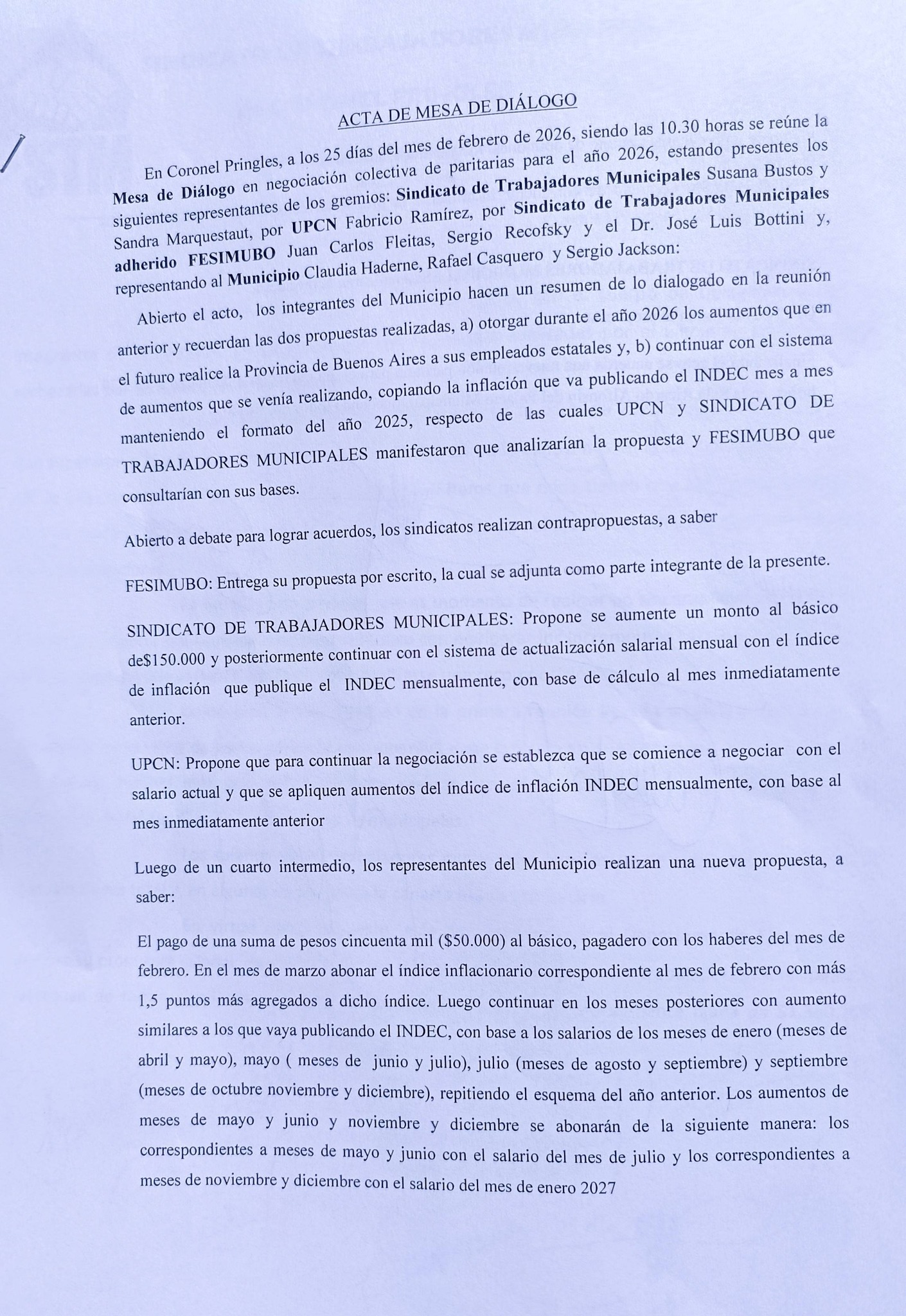 Según detallaron desde FESIMUBO Coronel Pringles a través de sus redes sociales, la primera oferta consistía en otorgar durante 2026 los mismos aumentos que disponga la Provincia de Buenos Aires para sus trabajadores estatales. La segunda alternativa planteaba continuar con el esquema de actualización mensual por inflación publicado por el INDEC, manteniendo el formato aplicado durante 2025.