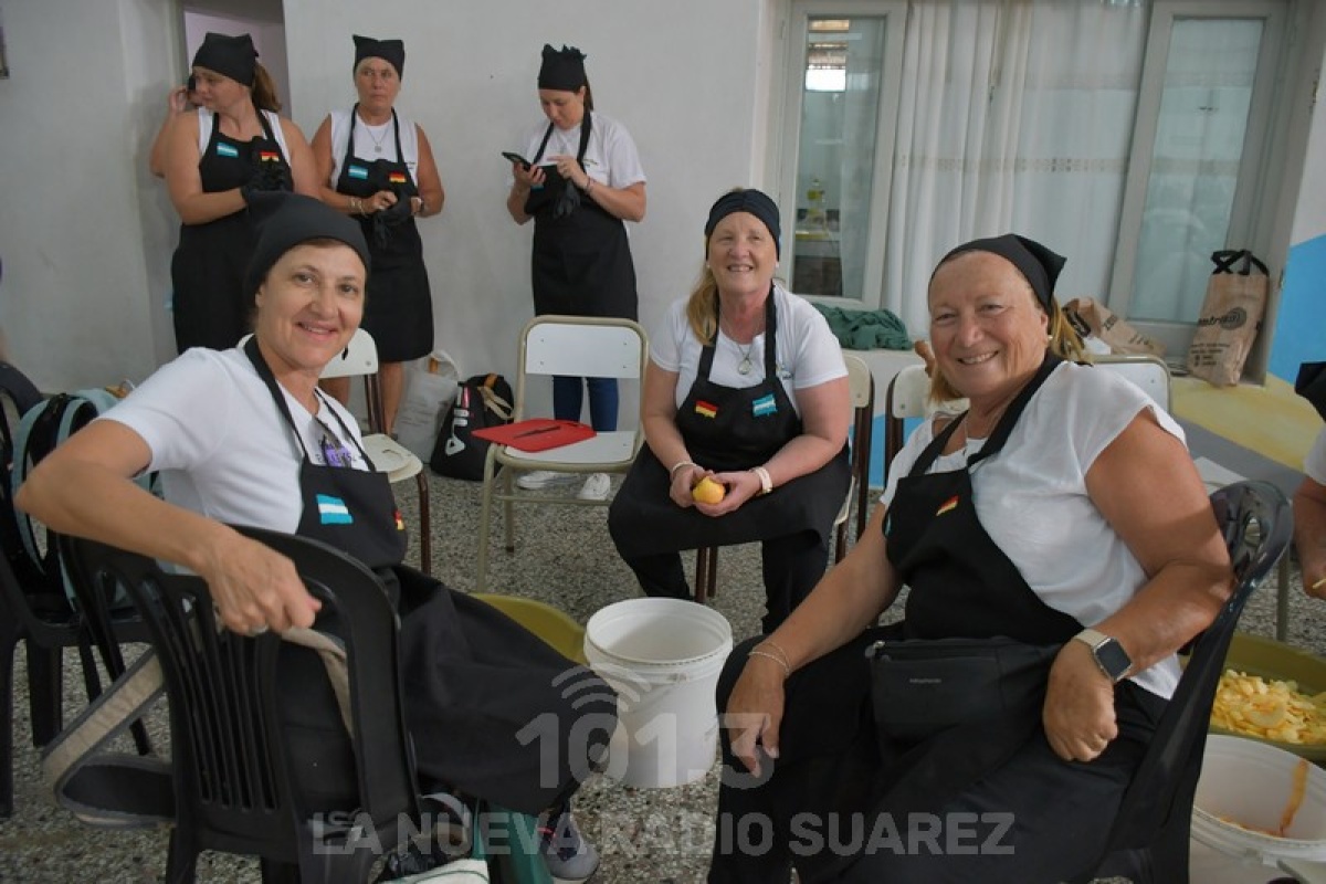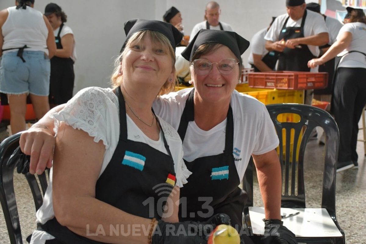La jornada comenzó temprano en el salón del Centro Cultural, donde durante horas se pelaron miles de manzanas que serían la base del relleno. Ese trabajo silencioso y paciente fue el primer paso de una elaboración que luego se trasladó al espacio público, ante la mirada de vecinos y visitantes que acompañaron cada etapa del proceso.