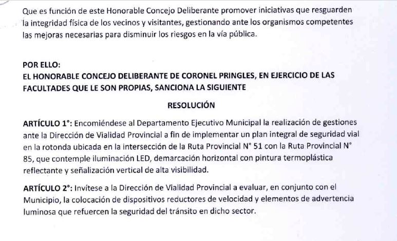 Durante la primera sesión ordinaria del año del Honorable Concejo Deliberante de Coronel Pringles, el bloque de "La Libertad Avanza", presentó un proyecto de resolución que apunta a mejorar las condiciones de seguridad vial en la rotonda ubicada en la intersección de las rutas provinciales Nº 51 y Nº 85. La iniciativa fue derivada a la comisión de Obras Públicas para su análisis.