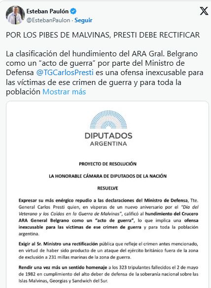 "En vísperas de un nuevo aniversario por el Día del Veterano y los Caídos en la Guerra de Malvinas calificó el hundimiento del crucero ARA General Belgrano como un -acto de guerra-, lo que implica una ofensa inexcusable para las víctimas de ese crimen de guerra y para toda la población argentina", dijo Paulón.