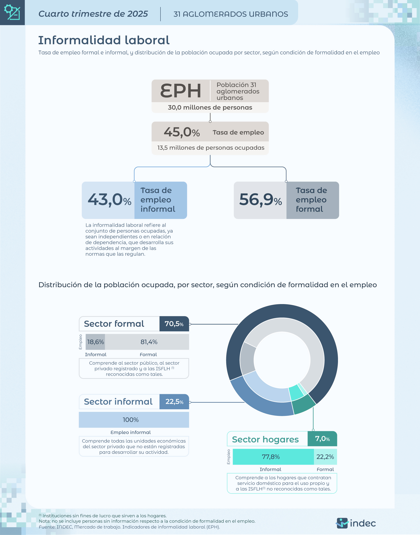 El informe del INDEC también revela que la reducción de la informalidad no fue homogénea y se observa un aumento sostenido del empleo registrado en algunas actividades, mientras que persisten altos niveles de desprotección social en otras. El organismo oficial estima que el 56,9% de la población ocupada accede hoy a empleo formal.