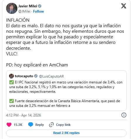 El mandatario adelantó en su cuenta de la red social X que el 3,4% de inflación registrado en marzo "Es un mal dato" y adelantó que iba a explicarlo durante esta reunión. Fuente: Diario Popular