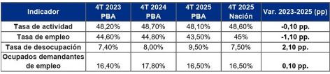 Al mismo tiempo, se observa una caída tanto en la proporción de personas ocupadas (tasa de empleo) como en la de quienes participan activamente en el mercado laboral (tasa de actividad). "Cuando ambas tasas disminuyen simultáneamente, suele indicar que una parte de la población dejó de buscar empleo, lo que puede estar asociado al desaliento", señalan desde el CEPA.