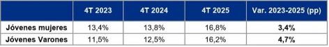 En el último trimestre del 2025, la tasa de desocupación alcanzó el 16,8% en mujeres jóvenes y el 16,2% en varones jóvenes, evidenciando incrementos de 3,4 y 4,7 puntos porcentuales (p.p.) respectivamente desde 2023. Ambos guarismos se encuentran muy por encima del promedio nacional (7,5%).