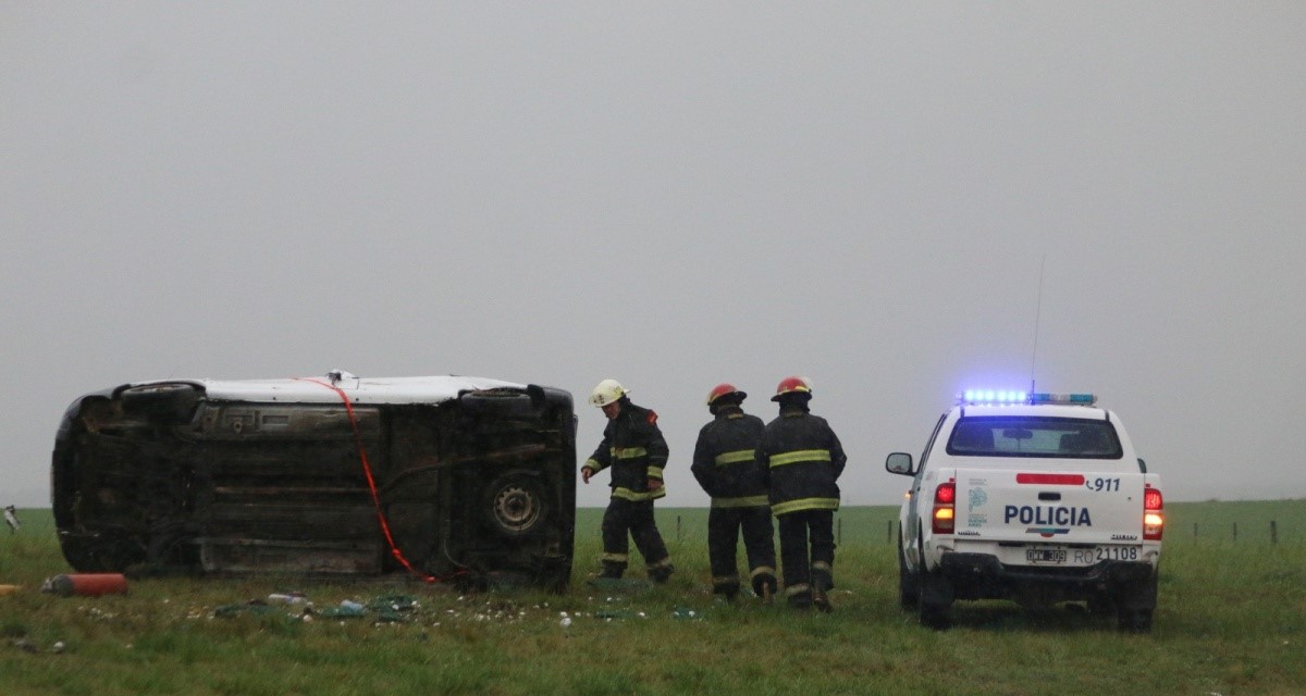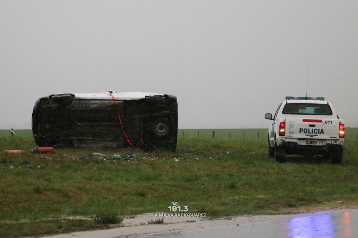 Según informó La Nueva Radio Suárez, minutos antes del mediodía del sábado lluvioso en prácticamente toda la provincia de Buenos Aires se produjo el vuelco de un utilitario, Peugeot Partner a 22 kilómetros de Coronel Suárez en dirección a Pigüé, sobre la Ruta Provincial 67, a 7 kilómetros del acceso a Cura Malal.