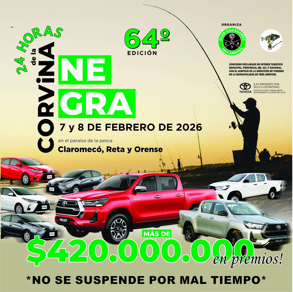 Uno de los grandes atractivos de esta edición será el importante pozo de premios, que supera los 420 millones de pesos. En total se entregarán más de 85 premios, entre ellos siete vehículos cero kilómetro. La corvina negra de mayor peso se llevará una Toyota Hilux 4x4, mientras que el segundo y tercer puesto obtendrán una Toyota 4x2 y un Toyota Yaris, respectivamente.