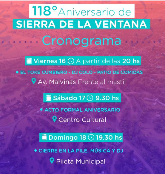 Sábado 17 (09:30 hs): Se llevará a cabo el Acto Formal Aniversario en el Centro Cultural de la localidad. La Intendente de Tornquist Estefanía Bordoni encabezará la ceremonia oficial para conmemorar la historia y el crecimiento de la localidad.
